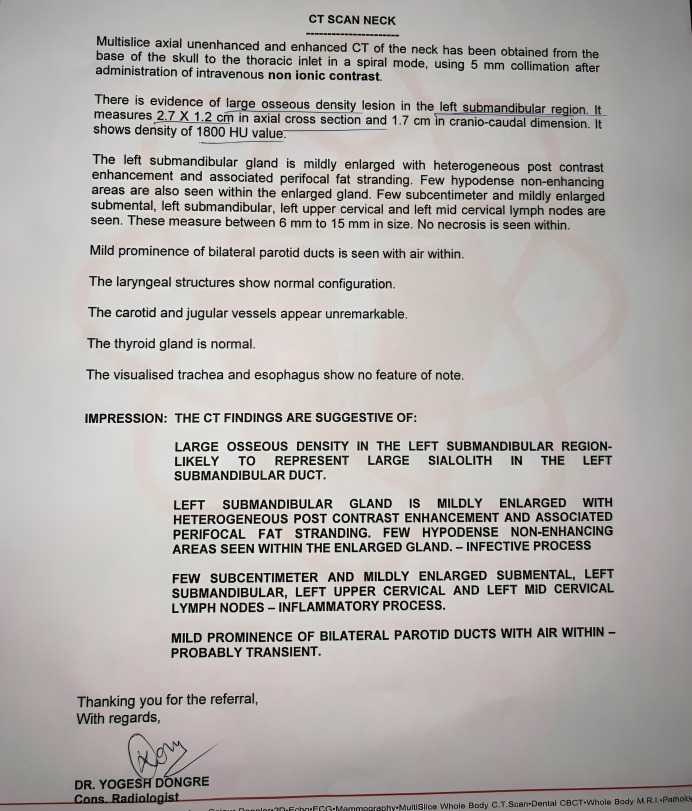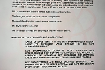 CT SCAN shows Sialolith / calculus ( Stone ) in submandibular gland duct